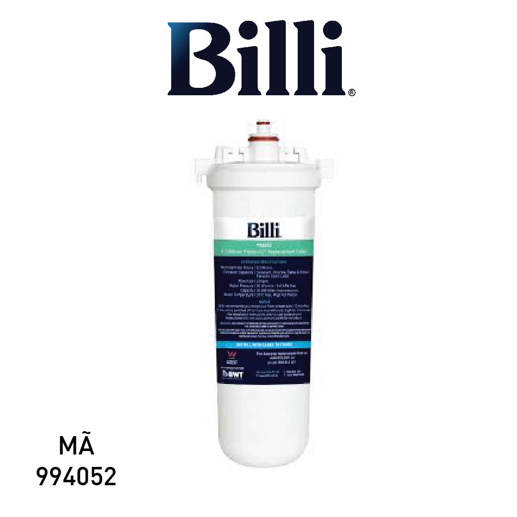 - Lõi lọc Billi (Mã: 994052) có công suất lọc 30.000 lít sử dụng vật liệu than hoạt tính (không liên kết;, lõi lọc mang lại khả năng xử lý tối đa tồn dư hoá chất và Clo trong nước và loại bỏ kim loại nặng (chì)